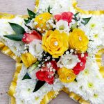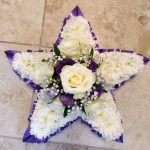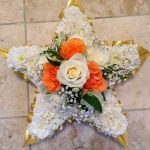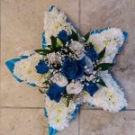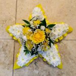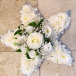 Typically created with a crisp base of white double chrysanthemums, the star design provides a clean, structured canvas that can be enhanced with delicate floral sprays, roses, or seasonal blooms in the colour palette of your choice. Each flower is arranged with precision on a secure, water-soaked floral foam base, ensuring the star shape remains defined, full, and fresh throughout the service.